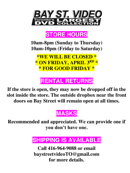 We have a Podcast! What new movies are coming out? What films have been remastered? What do you have to see? All the answers can be found on the weekly The Bay Street Video Podcast - Click for the link